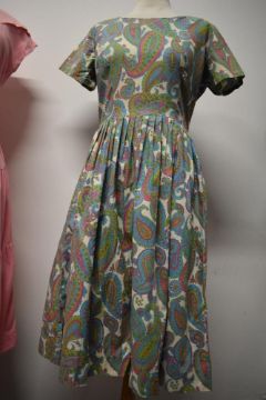A late 1940s/ early 1950s pink medium weight cotton day dress, having buttons to front, peter pan collar and tiered skirt (zip or press stud needed to side) sold with a fabulous 1950s/ early 1960s paisley cotton day dress with pleated skirt and rear metal zip.