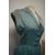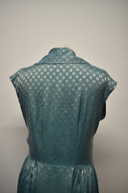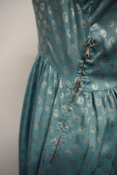 A late 1940s/early 50s day dress of sea foam green medium weight silk, having gathers to the fabric at the hips, faux button over press stud fastening to bodice and side metal zip.