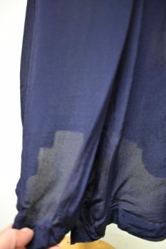 A 1940s floppy navy blue rayon or similar day dress, having soutache style braiding to bodice and buttons to nape, good condition, however zip or press studs needed to side opening and a length of stitching needs re sewing towards hem.