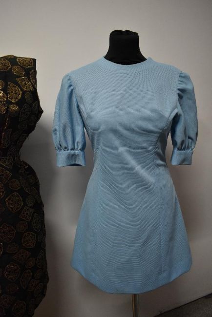 Three 1960s dresses, including two with metallic thread accents and baby blue mini dress with puff sleeves.