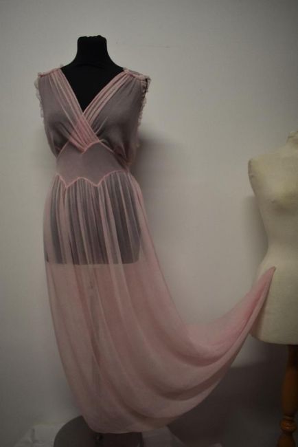 A floaty 1930s silk chiffon nightdress, in pale pink having delicate white floral pattern, cross over bust with ruffles to bodice and tie fastening to waist, medium to larger size.