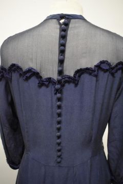 A 1930s navy blue silk dress, having sheer bodice with lace to scalloped section and hem, buttons to back and side metal zip, sold with a similar purple dress,which has damage to bodice.
