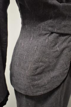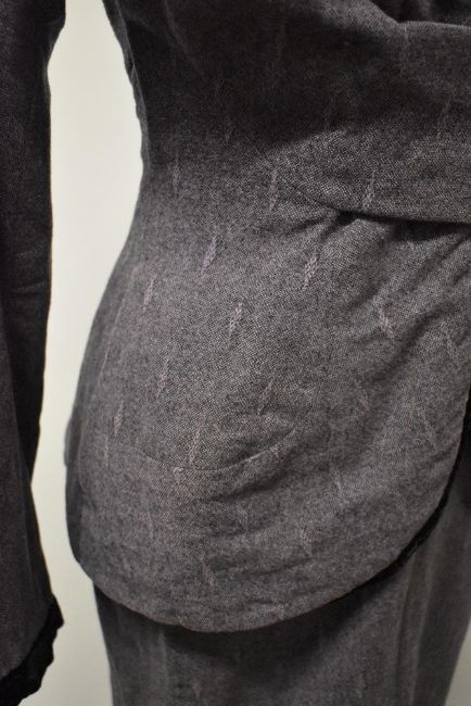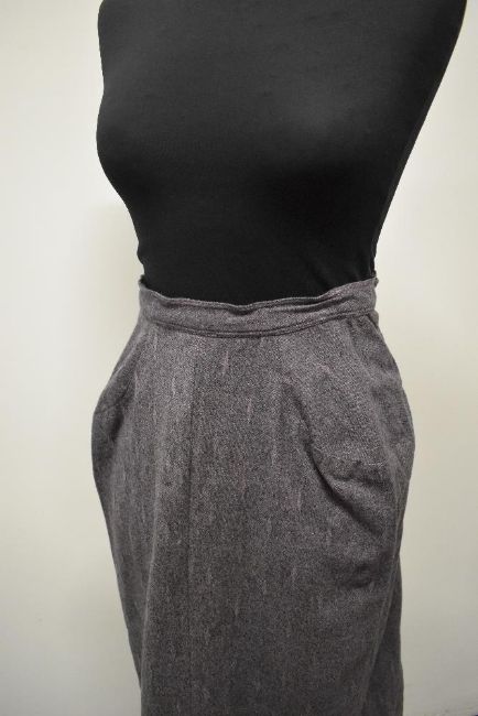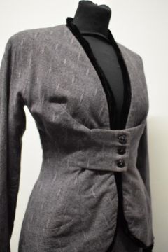A beautifully tailored deep heather coloured textured wool 1940s skirt suit, having black velvet edging to jacket and cuffs and black glass button fastening to centre, skirt has two rear metal zips.