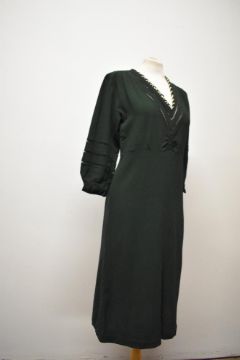 A 1930s bottle green day dress, having ladder work to sleeves and bodice, with cream twist detail to V shaped neckline.