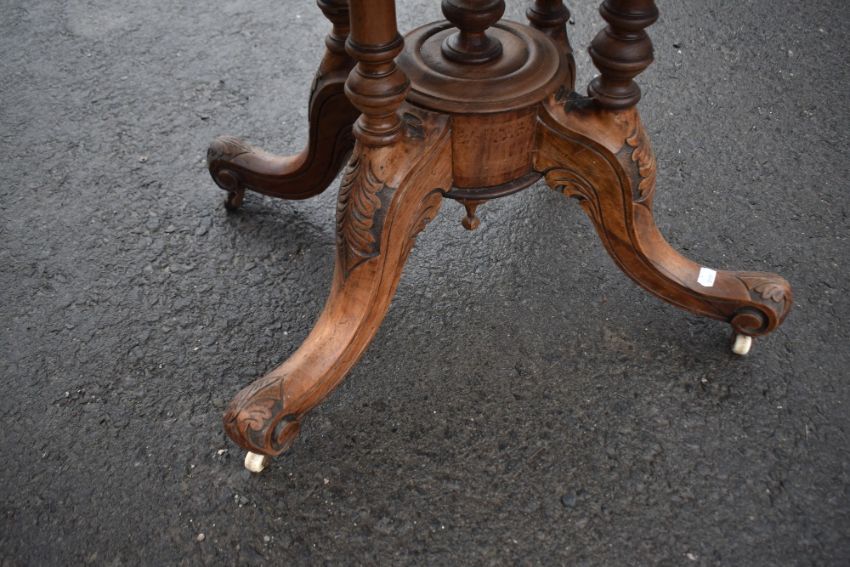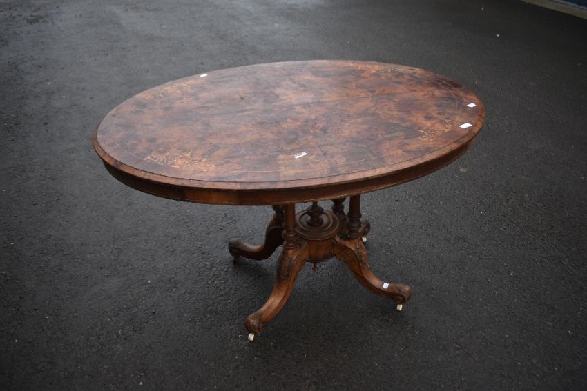 A 19th Century walnut breakfast table having inlaid oval top on quadruple turned column supports and splay legs, width approx 120cm