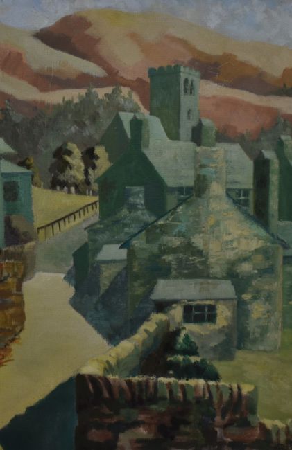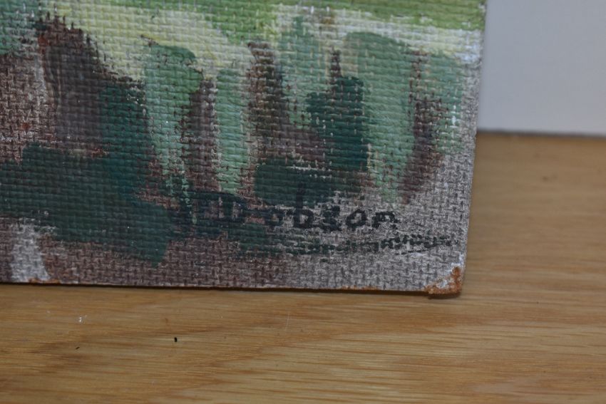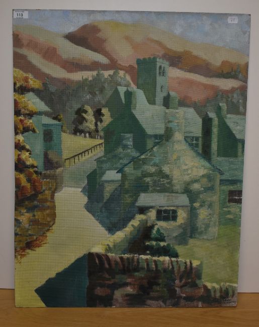 J.Dobson (20th Century), oil on board, A brightly coloured village scene with church and hills beyond, signed to the lower right, measuring 58cm x 76cm overall