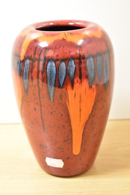 A vintage Poole Pottery vase, having red, orange and blue glaze.