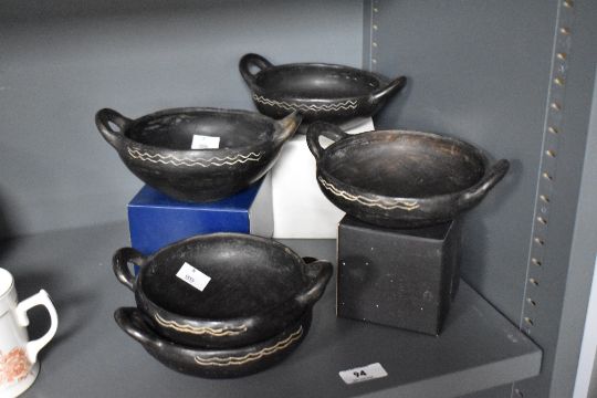 Five Hellenistic style wooden bowls of varying sizes, the largest having a diameter of 14cm