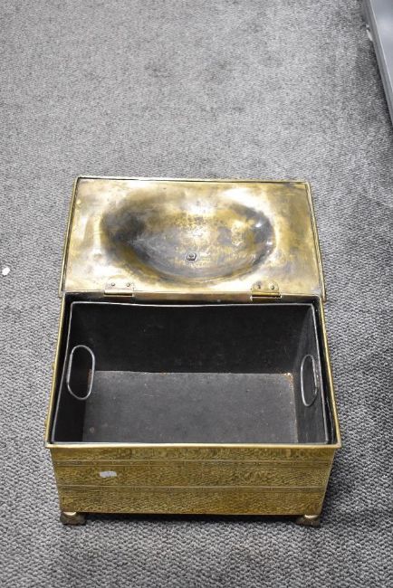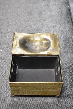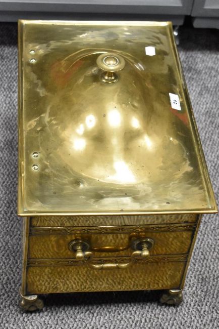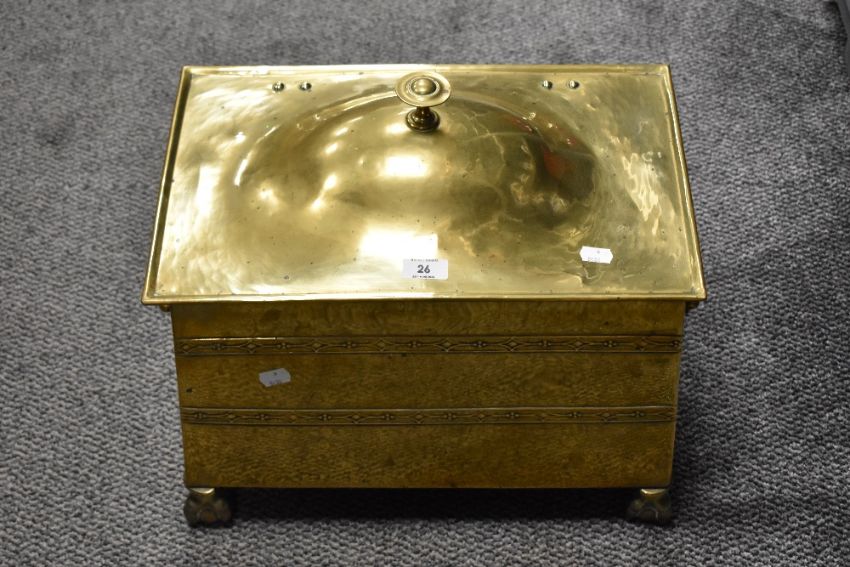 An Edwardian brass coal bin, having hinged lid, decorative banding design, and raised on four ball and claw feet, measuring 40cm x 32cm x 45cm overall