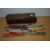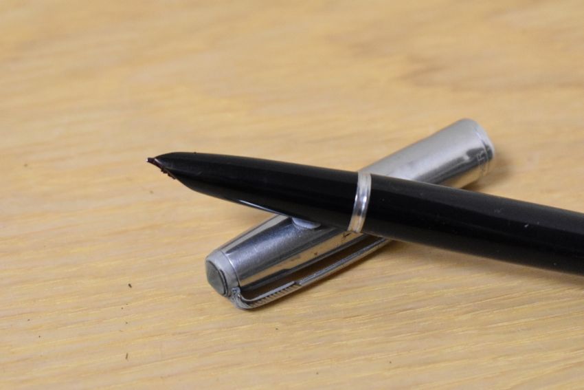A 20th Century wooden sliding pencil box, measuring 21cm long, with vintage pens including a Parker Duofold fountain pen and a Dickinson fountain pen