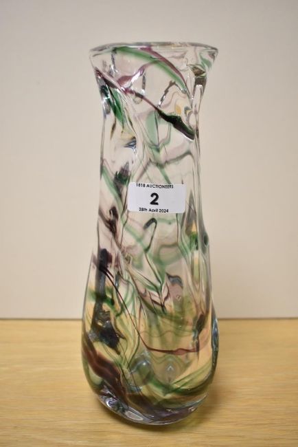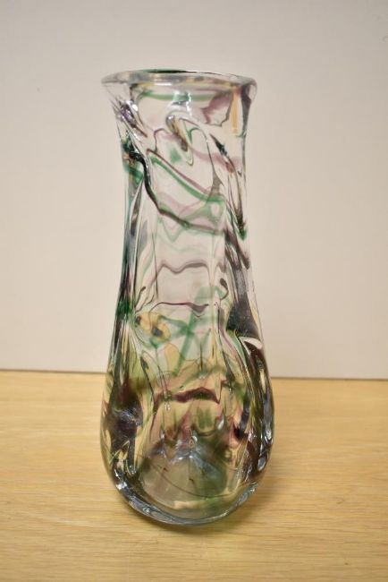 A vintage Ray Annenberg for Whitefriars Heather glass vase of tall knobbled form with Purple and green swirled design. Catalogue No 9845