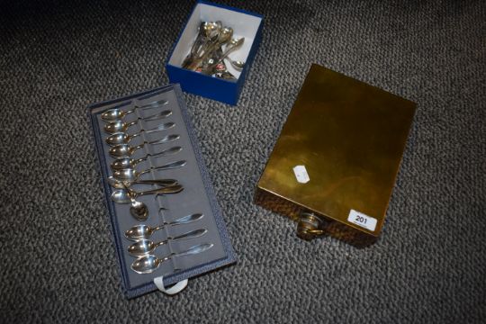 A boxed set of 12 Zilfa Pleet, Zilverfabriek teaspoons, a small amount of display spoons and a brass carriage feet warmer etc.