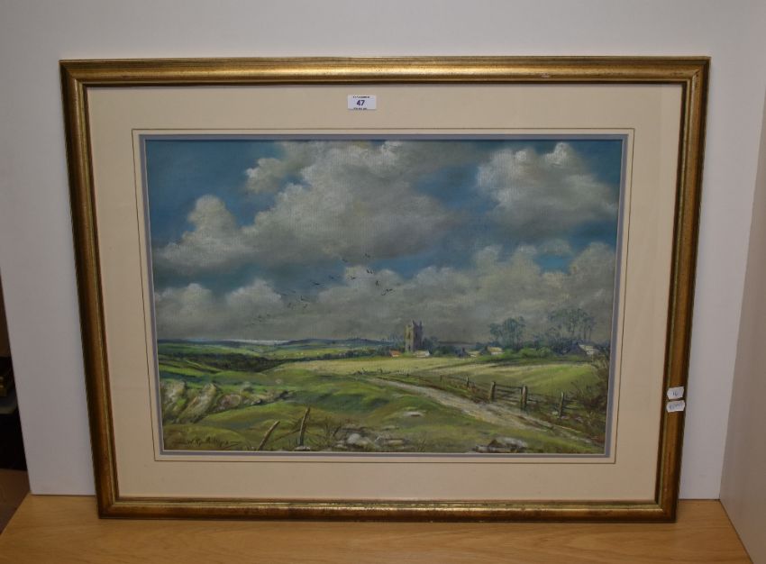 Walter Pip Phillips (20th Century, British), pastel, A countryside landscape with church and sea in the distance, signed to the lower left, framed, mounted, and under glass, measuring 42cm x 58cm, & 61cm x 81cm overall
