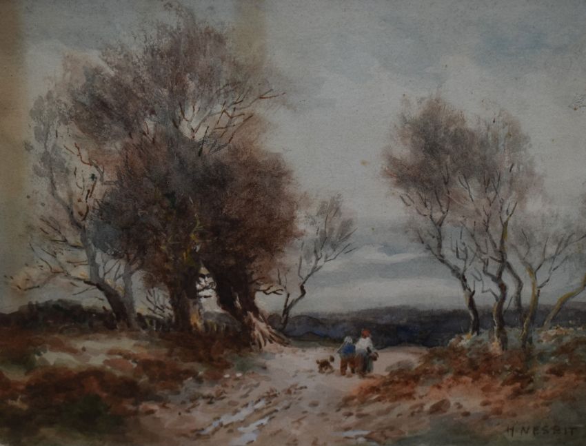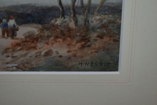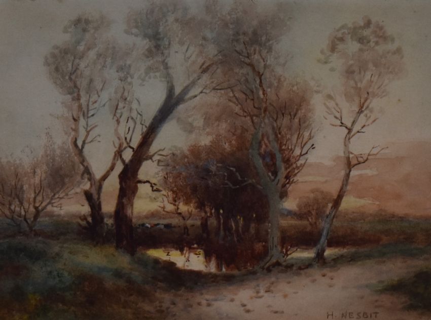 H.Nesbit (19th/20th Century, British), watercolour, Two illustrations of barren tree landscapes, signed to the lower right, framed, mounted, and under glass, each measuring 15cm x 19cm, & 39cm x 42cm overall, together with another watercolour of similar age, depicting a hilly landscape with lake to the foreground, indistinctly signed and with signs of foxing (3)