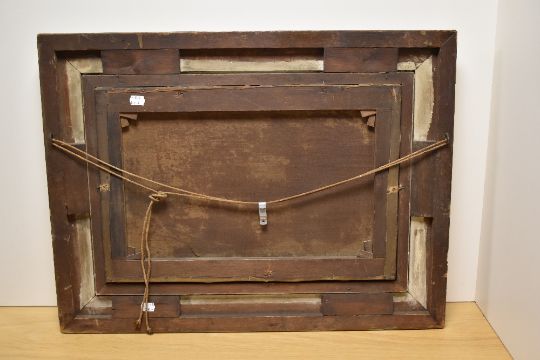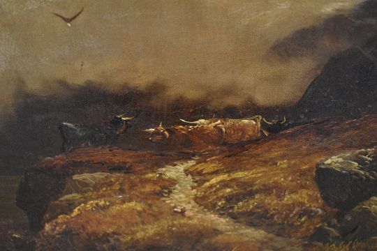 19th Century British School, oil on canvas, A dramatic Scottish Highland landscape depicting cattle resting on a lakeside track with rolling cloud above, displayed within a Victorian gilt wood frame, measuring 36cm x 50cm, & 56cm x 72cm overall