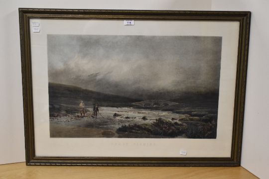 After Douglas Adams (1853-1920, British), coloured print, 'Trout Fishing', an atmospheric Scottish landscape depicting fishermen, framed and under glass, measuring 60cm x 80cm overall