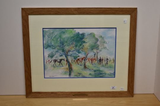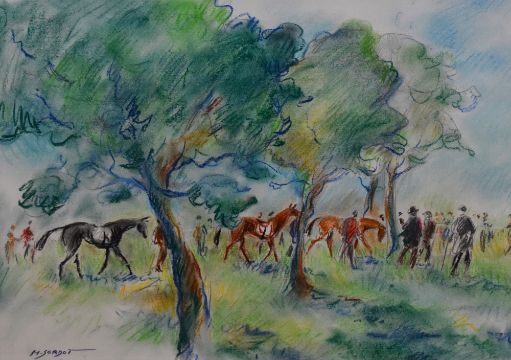 Matthieu Sordot (Contemporary, French), pastel, 'Criterium de Maisons-Laffitte', a depiction of the Chantilly horse racing event, signed to the lower left, dated 2014, framed, mounted, and under glass, measuring 30cm x 40cm, & 54cm x 64cm