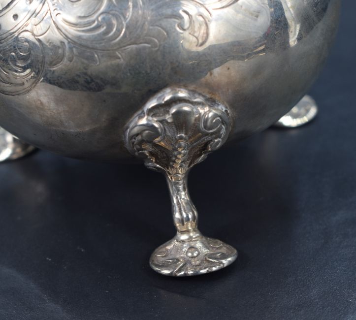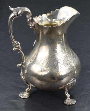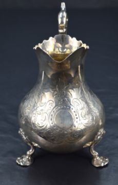 A Victorian silver cream jug of bluster form, having a conforming Chippendale style rim terminating into a pointed spout, opposed by a scroll handle with engraved floral decoration to body and vacant circular cartouche, raised on three scroll feet, rubbed marks for possibly London between 1856-1875, indistinct makers mark, 195g