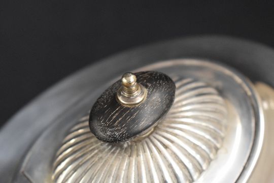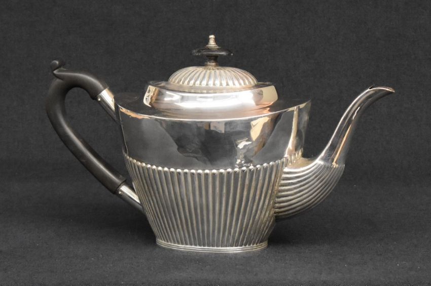 A Mappin & Webb silver tea pot of oval half-gadrooned form, with curved handle and marks for Sheffield, date mark rubbed, 463g gross