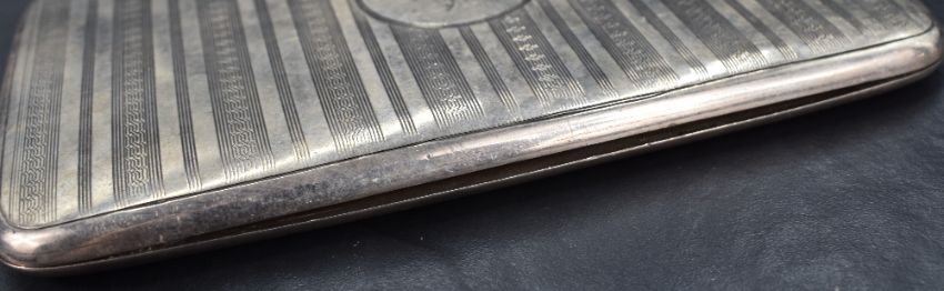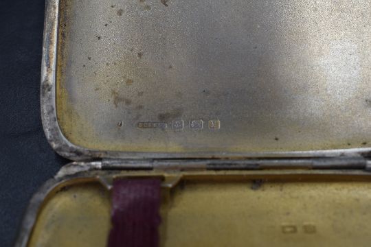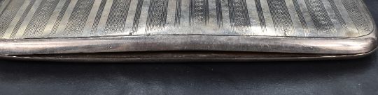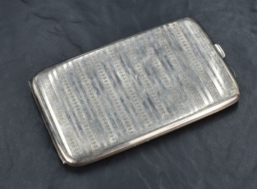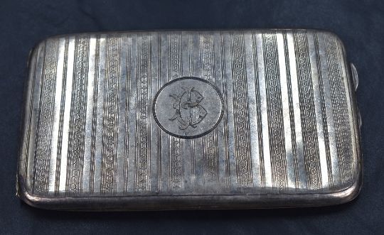 A George V silver cigarette case of rectangular form, having vertical stripes of engine turned decoration with a central circular cartouche engraved with 'IB' monogram, marks for Birmingham 1916, maker S Blanckensee & Son Ltd, 14cm x 8.5cm, 201g, gapping to the sides