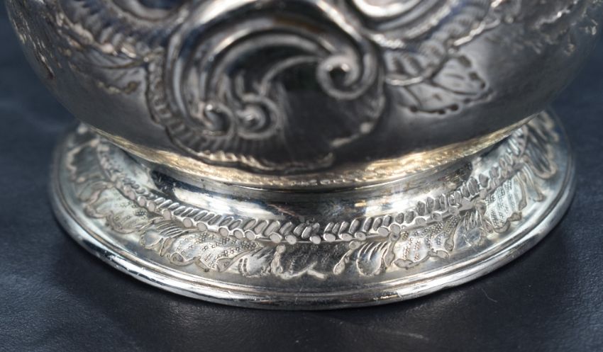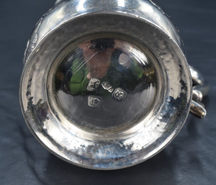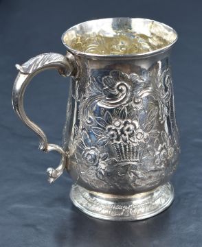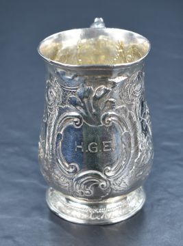 A George III silver tankard of baluster form, having a slightly flared rim and scroll handle, raised on a moulded circular foot, with later embossed floral decoration to body and foot with a central cartouche engraved 'H.G.E', clear marks for London 1773, maker possibly John King, 185g