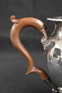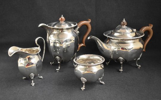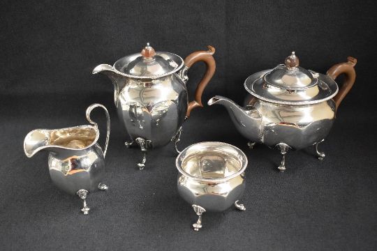 A George V silver four-piece tea set comprising a tea pot, hot water pot, sugar and cream, all of circular tapered and fluted form, the rims with gadrooned style moulding, raised on scrolled cabriole legs with whorl feet, marks for Birmingham 1919 and 1921, marker Ernest Druiff & Co., 1479.3g gross