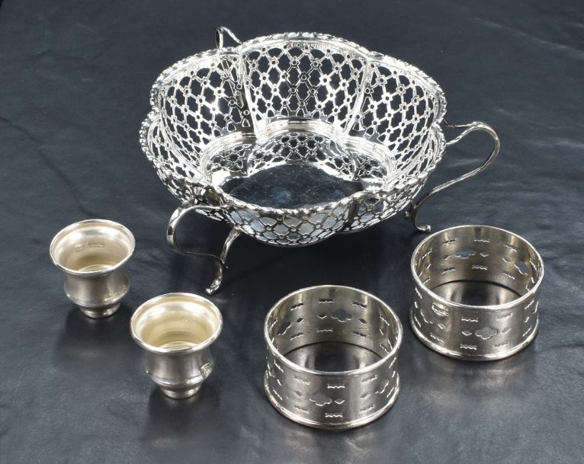 A silver bon bon dish of conforming lobed form, having a beaded rim and pierced design with three scroll handles also acting as cabriole legs, having rubbed hallmarks, sold along with two silver circular napkin rings having pierced design decoration, also with rubbed hallmarks, and a pair of silver candlestick scones having slightly flared dash engraved rims with a concave form and step moulding to the base, marks for Birmingham 1992, maker Laurence R Watson & Co, 132g gross