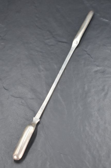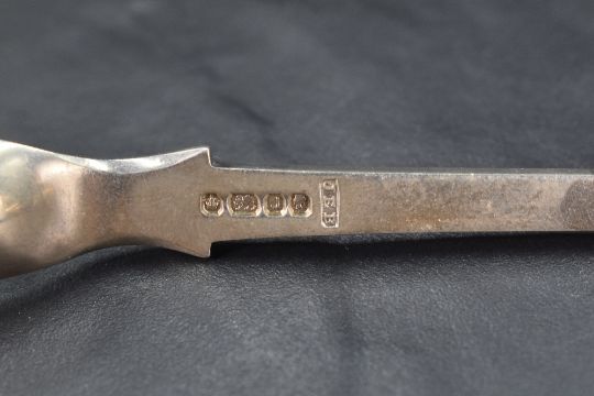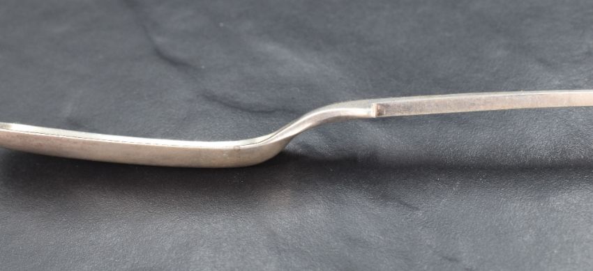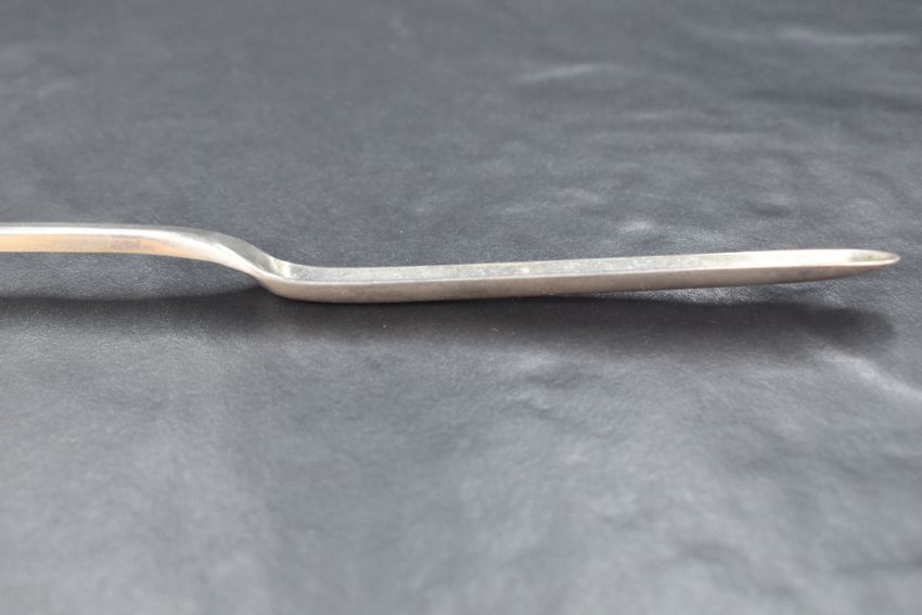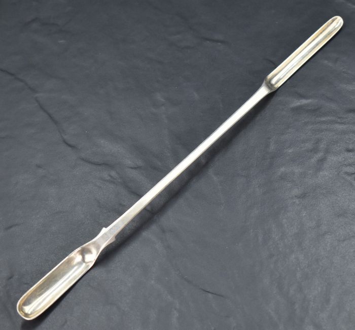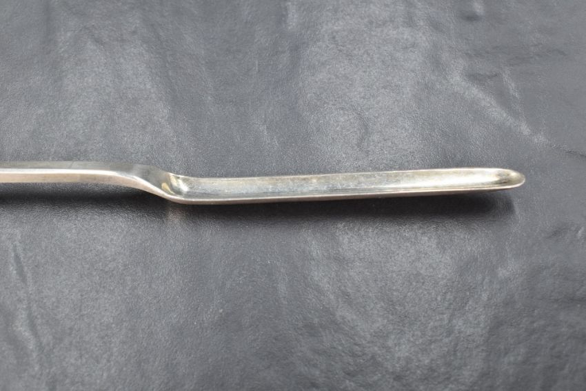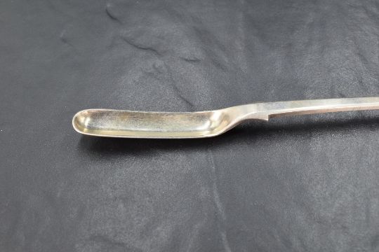 A Victorian silver marrow scoop, of elongated form, with pronounced drops, the broader end with flared shoulders, marks for Sheffield 1876, Walker & Hall (John Edward Bingham) 33cm, 60grams