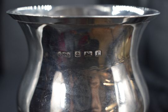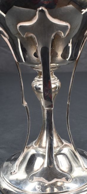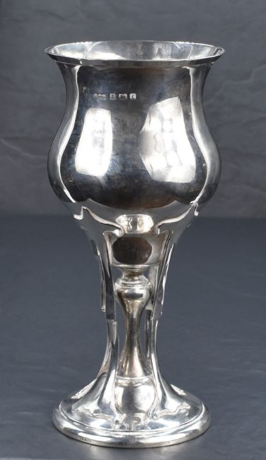 An Edwardian silver Art Nouveau chalice of flared bluster form on a knopped stem and moulded circular foot with sinuous supports, marks for Birmingham 1905, maker Elkington & Co Ltd, 22cm, 437.8g