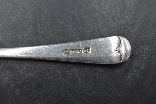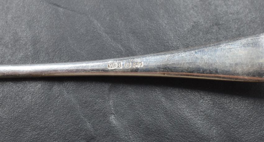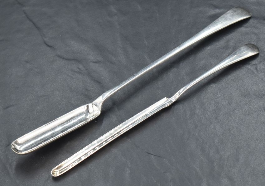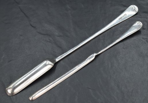 Two silver-plated Old English pattern marrow scoops, single scoops opposed by slender tapering handles, marked for Henry, Edward and Frank Atkin, Sheffield, and WB&CO
