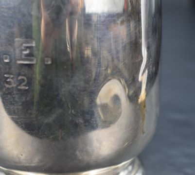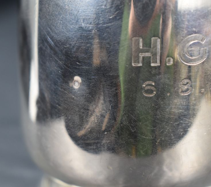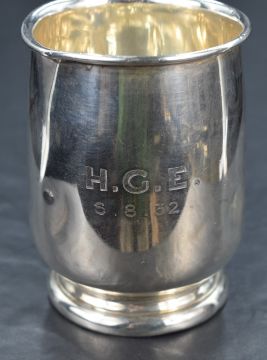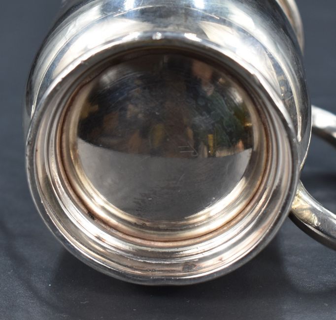 A George V silver tankard of circular form with looped handle, raised on a moulded circular foot, engraved 'H.G.E 6.8.32', marks for Sheffield 1931, maker Viner's Ltd (Emile Viner), 189g. Various dents to rim, body and foot