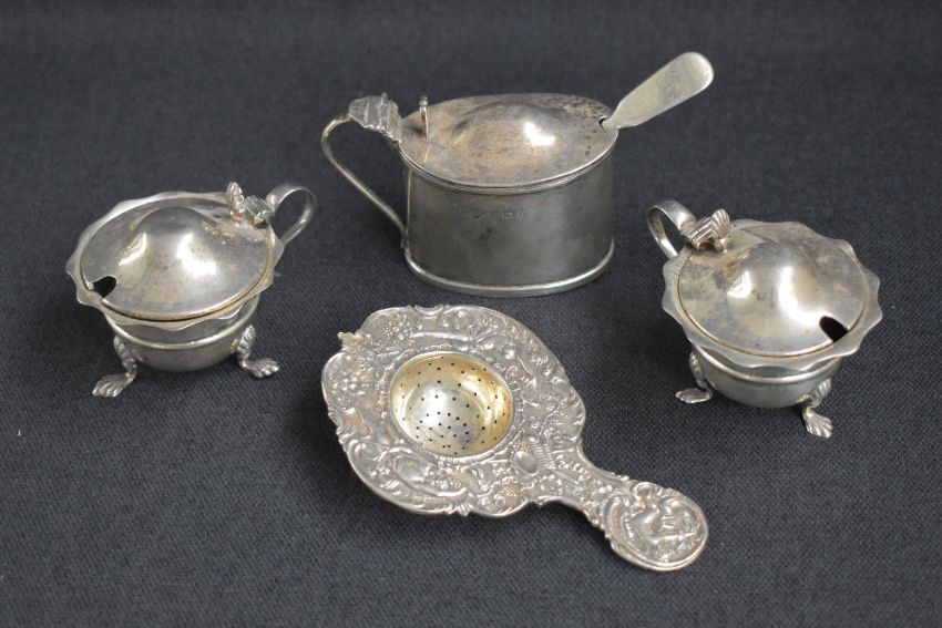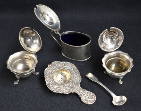A group of silver table wares, comprising a decorative embossed tea strainer having cherubs and scroll work, marks for London import 1922, maker Berthold Hermann Muller, a pair of condiment pots of circular form having flared sinuous rims and scroll handles, raised on three cabriole shell motif feet, marks for Birmingham 1924, maker Levi & Salaman, one with rubbed marks, sold along with a condiment pot of oval form having blue glass liner and moulded decoration to rim and base, with an Old English design condiment spoon, marks for Birmingham 1904 and rubbed makers mark, 251g gross