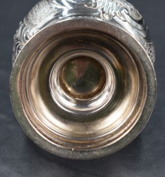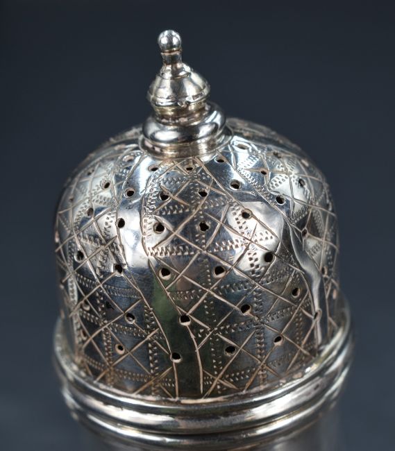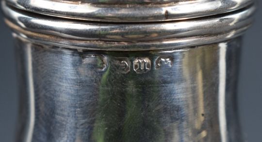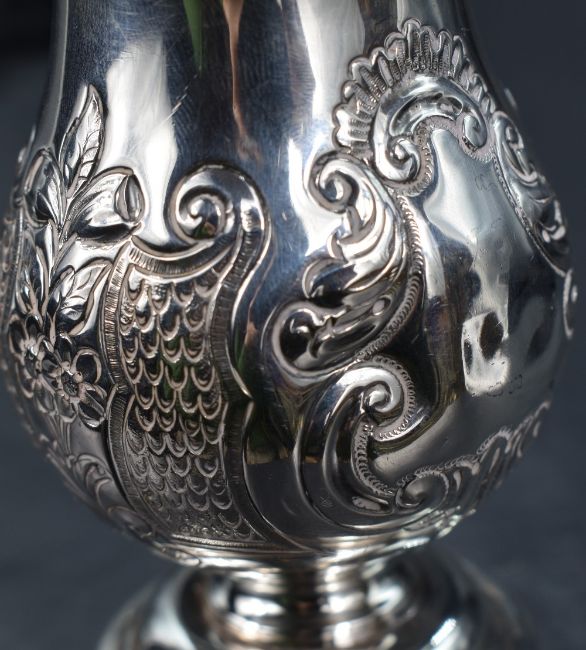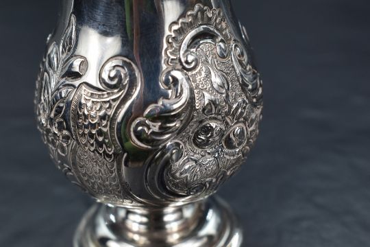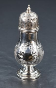 A Victorian silver sugar caster, having a pierced, finial topped and engraved cover over the foliate and scroll embossed baluster body with vacant cartouche, raised on a stepped circular foot, marks for Birmingham 1894, makers mark rubbed, 14cm, 114grams some slight denting/compression to body and cover.