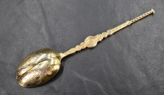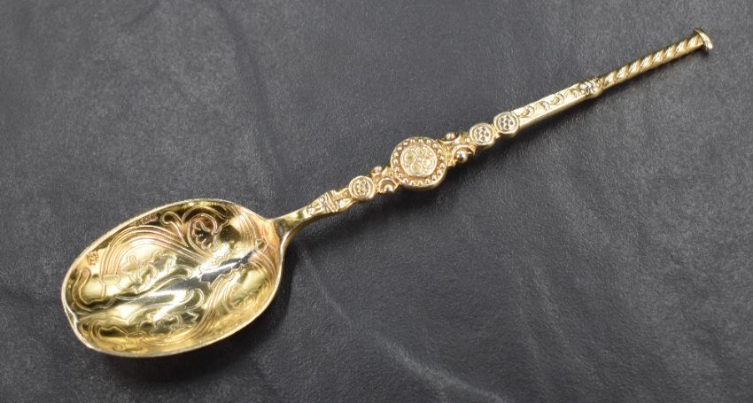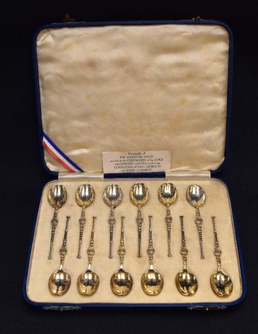 A set of twelve early 20th century silver spoons, replicating the Anointing Spoon used as part of the coronation ceremony of British monarchs since James I in 1603, produced to commemorate the coronation of George VI and Queen Elizabeth in 1937, marks for Birmingham 1936, maker Barker Brothers Silver Ltd, 127g