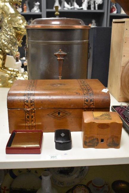 A vintage copper lidded coal bucket, an inlaid 19th century box, Af, a 19th century snuff box, a Mauchline ware box, made from wood that grew on Stirling castle slopes and a powder compact.