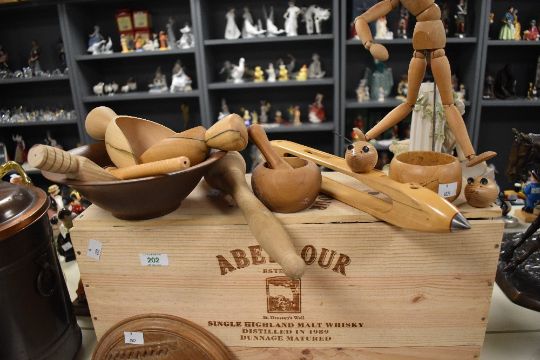 A selection of treen, including pestle and mortar, advertising crate for Aberlour Single Highland malt whisky, grain scoops etc.