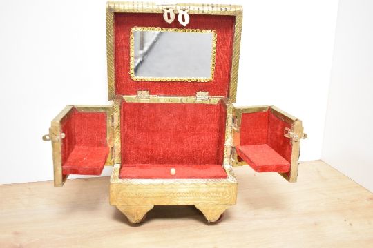 A vintage Indian jewellery box in the form of a vardo, with impressed animals to brass, over wooden base, sat on four wheels.