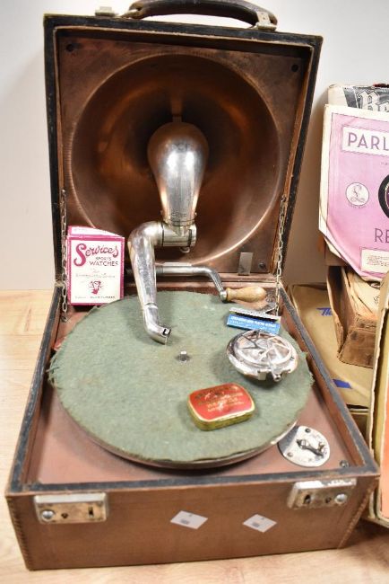 An early 20th Century portable gramophone, with stitched brown leather case, measuring 26cm x 30cm x 29cm when closed, together with a selection of vintage records
