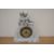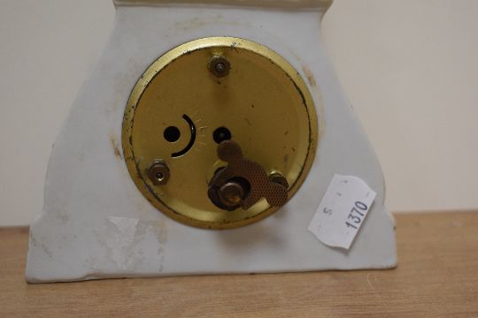 A 20th century white ceramic mantel clock, depicting two young children reading a book to top and moulded swags to underside of dial.