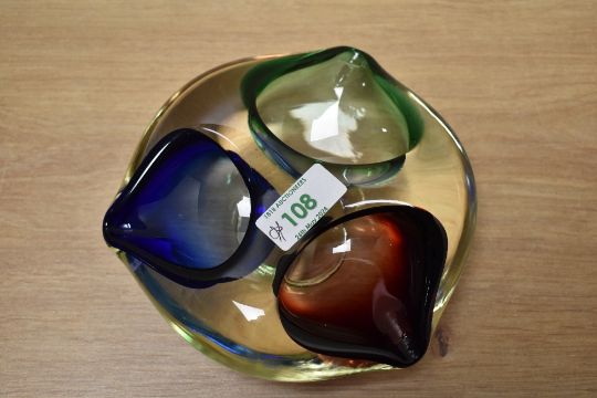 A Romanian art glass tricoloured ashtray, having three divisions, measuring 16cm wide, and an art glass square dish with Millefiori style decoration