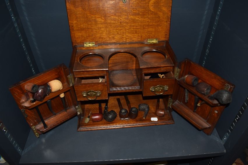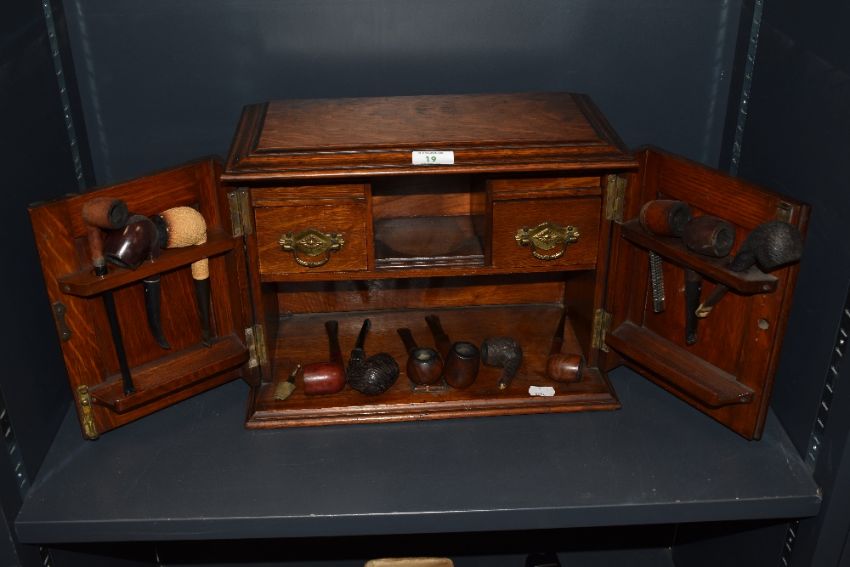An early 20th century gents smokers cabinet with integrated pip racks, drawers and a selection of pipes, having carved doors and brass fittings.