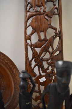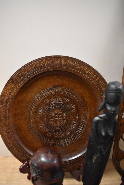An African hardwood carved wall plaque, of bowed form, decorated with animals including a lion, rhinoceros, and elephant, measuring 73cm long, together with other African hardwood items, a carved wooden charger, having a diameter of 34cm, and a selection of carved wood figures and bust