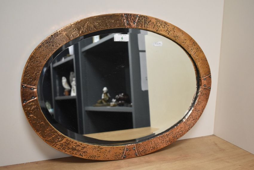 A circa 1900 Arts and Crafts hammered copper framed mirror with original bevelled glass.