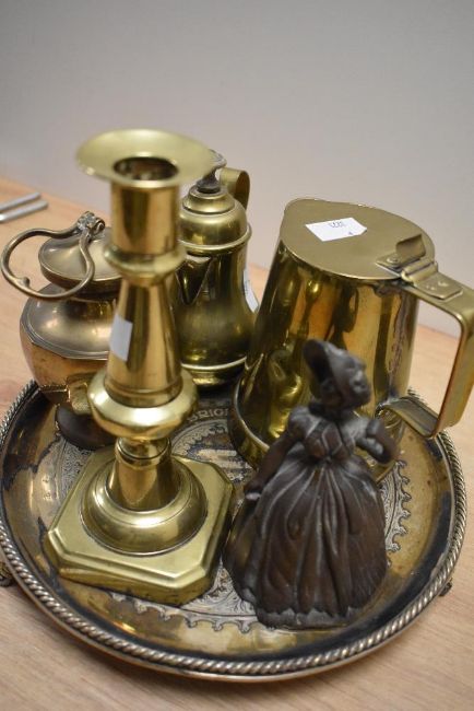 A collection of brass, a bell in the form of a lady and a 1930s barometer, including interesting milk jug or similar with lid, marked for Wolverhampton to underside.
