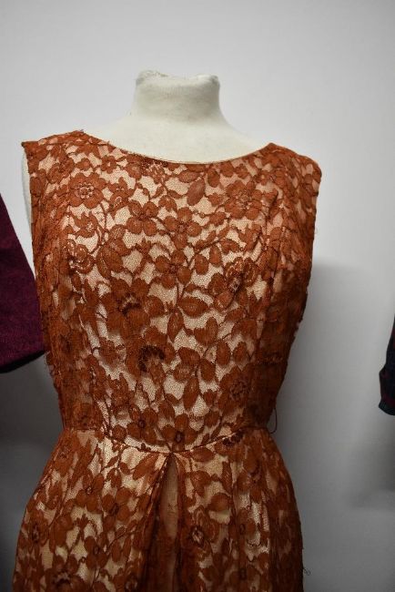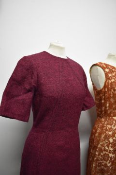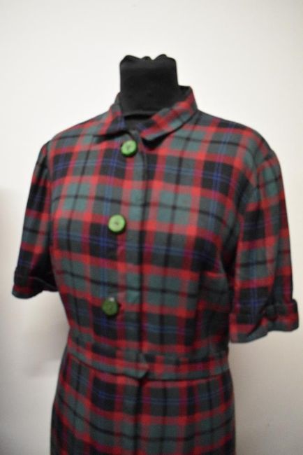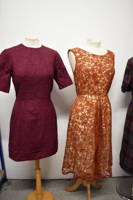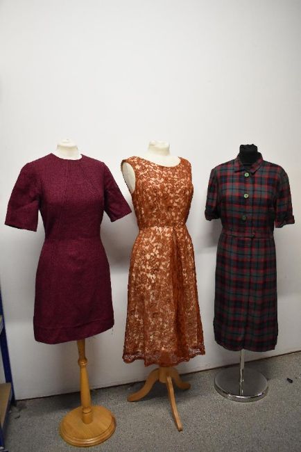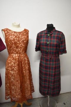 Three vintage 1950s to 1960s dresses, including plaid cotton in a larger size, with belt.