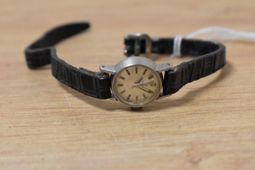 A lady's Omega wristwatch having a baton numeral dial to small silvered face in a steel case on a leather strap, damage to glass