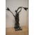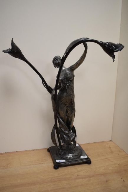 An Art Nouveau style lamp base, with double stemmed flower lamp holders, with classically styled maiden to centre.