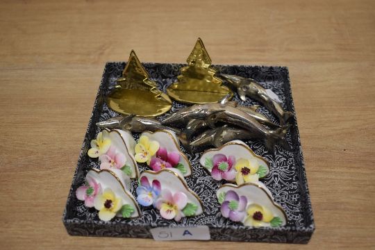 Six Denton porcelain flower arrangement form place card/setting stands, a small collection of chrome dolphin studies, and a pair of small brass Christmas tree ornaments