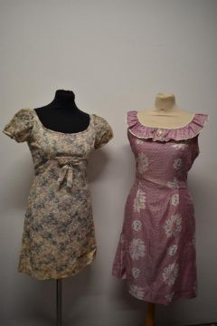 Two 1960s day dresses in pink hues, one having frilled neckline.