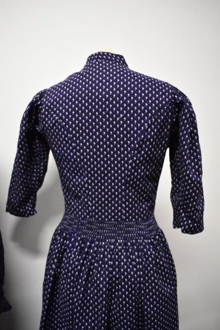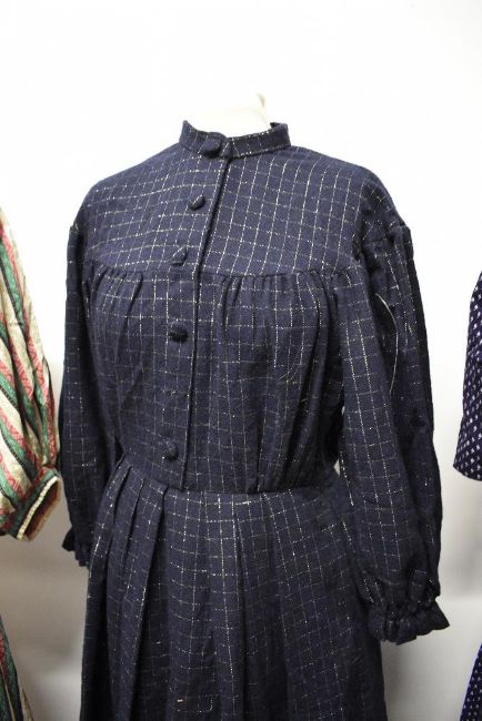 Three vintage dresses, including bohemian style full length dress, navy blue dirndl dress and navy blue wool dress.